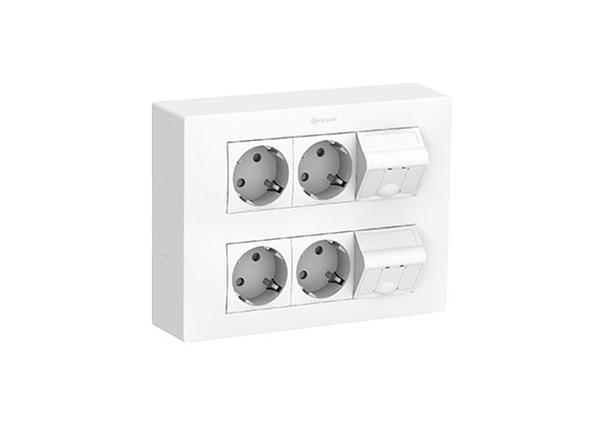 Kit Caja de Superficie de 6 módulos de 45x45mm con 4 schukos blancos y dos placas para RJ45 Keystone
