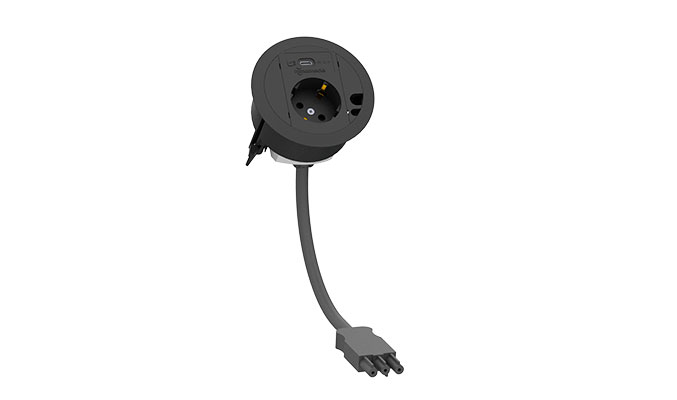 Punto de conexión rápida schuko, cargador USB 2.1A tipo C y salida de cables blanco